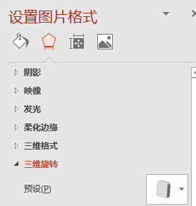 3、选中组合包括中间一张,点击“设置图片格式” 里的“效果”按钮,在“三维旋转” 里选择“透视“效果,调整合适的表达效果;