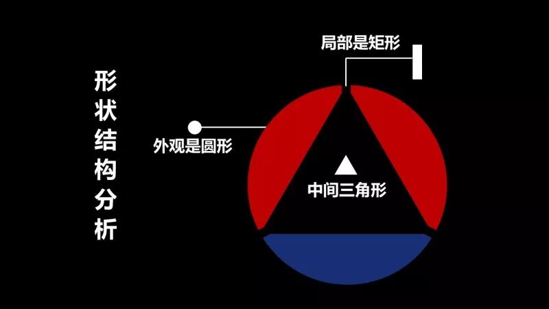 首先,来分析第一张图的架构。先宏观看外表,是个圆形;其次看圆形轮廓留出的三个口是矩形,最后看中间是个三角形。下图更直观
