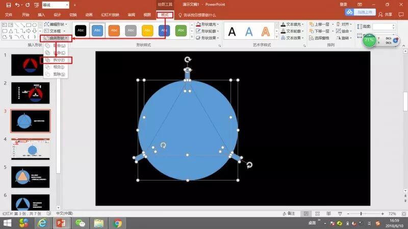此时我们把画出的内容全部选中,然后点击格式——合并形状——拆分
