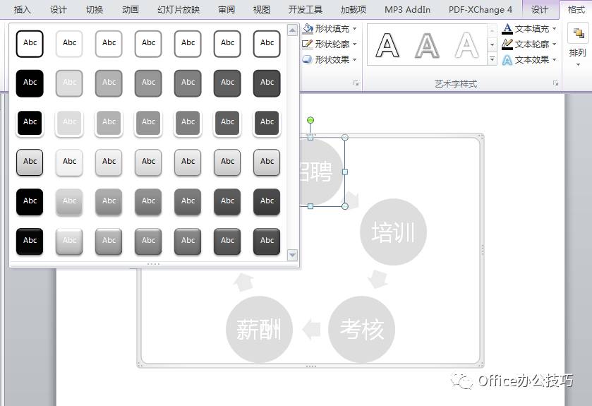 最近有个朋友在做PPT的汇报,遇到了这样一个问题。他说,为什么我插入的形状,默认样式里只有黑白色呢,其他PPT中就不是这个样子的。