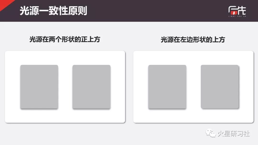 如上图:当左边形状选择了下阴影时,根据光源一致性原则右边的形状可以选择下阴影——光源在两个形状上方较远的距离,也可以选择右下方阴影——光源在左边形状的上方。