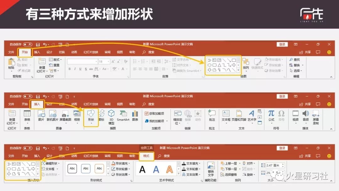 开始、插入、格式,这三个地方都设置了可以增加形状的位置。