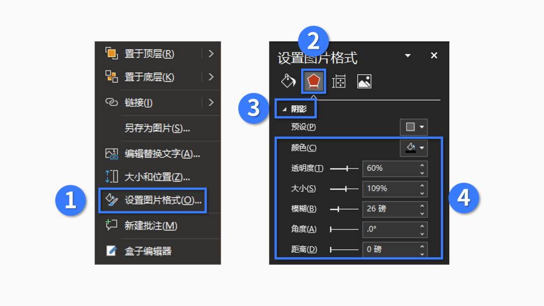 接着再右击这张裁剪过的图片,点击【设置图片效果】-【效果】-【阴影】,然后瞎鸡儿设置一下阴影的参数,以下是我用的参数,你可以参考一下: