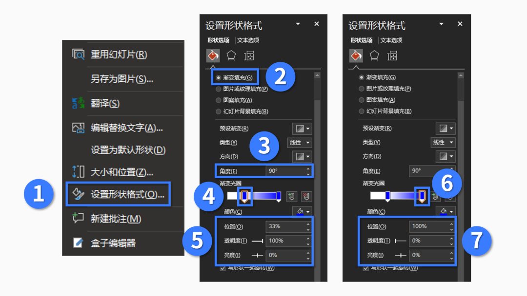 接着右击矩形,点击【设置形状格式】-【填充】-【渐变填充】,渐变参数如下: