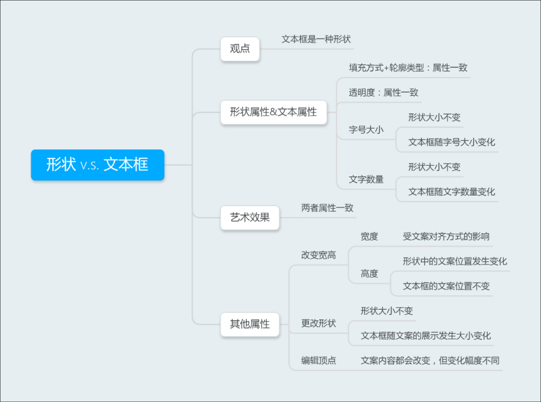 相同点:形状与文本框同样都有着形状属性及文本属性,即背景框和文本均可设置不同的填充和描边效果,还可以设置透明度。
