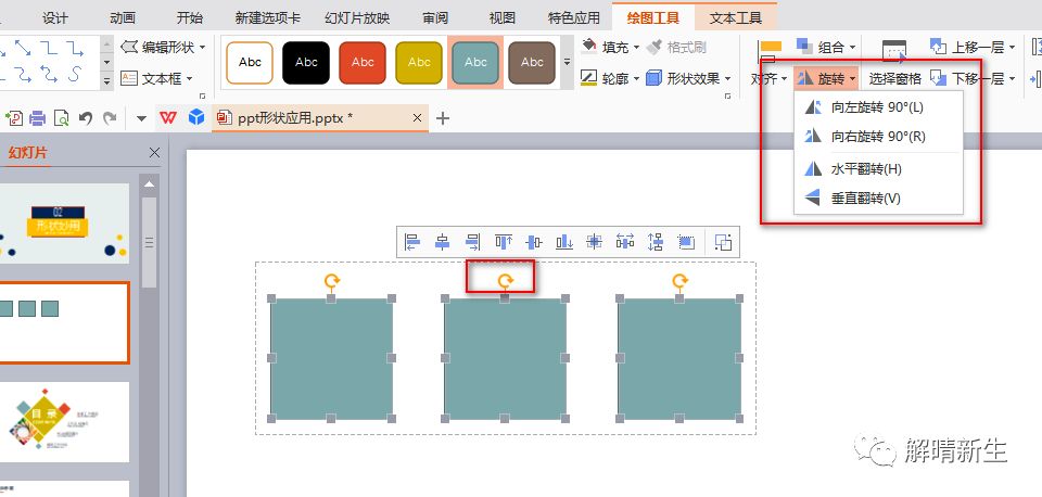 旋转菜单下只能实现90度、180度的旋转。怎样实现45度旋转呢?