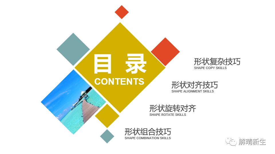 如果大小不一、错落有致的形状排版不容易掌握,那么内容页的这些形状排版就很轻松了吧?
