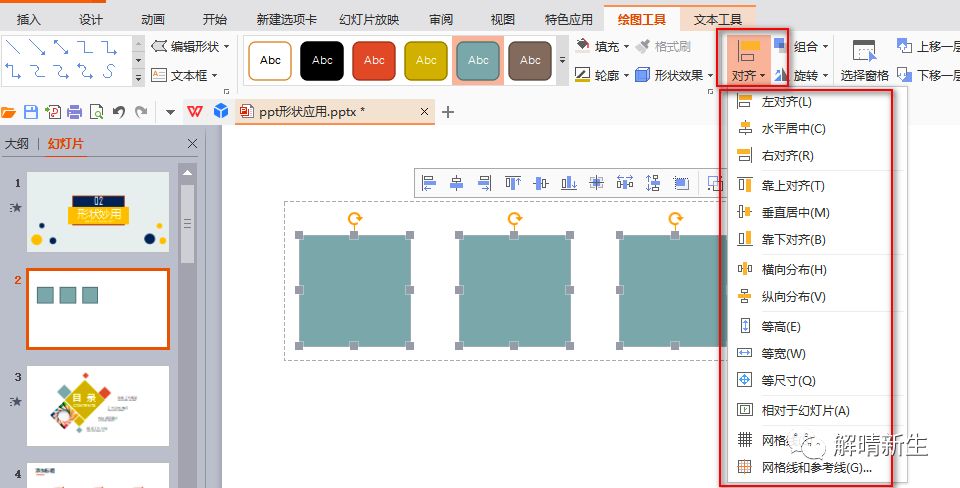 例如,你想让几个正方形水平对齐、横向间距相等,你可以这样操作。
