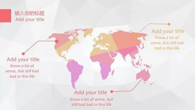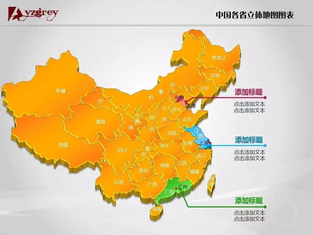 这个图在大家的日常汇报肯定经常遇到,我们在讲公司的国内外市场分布,国内外分支机构,各省或各大区销售额等,一般都会用地图呈现(地图哪里找?大家可以下载PPT美化大师,软件下载路径移步【PPT提速】字体替换火箭版,下载安装好之后,在美化大师功能区中点击【形状】输入搜索关键字“地图”就会有世界地图,中国地图,以及中国各省的地图)。在地图上将特定的区域用颜色填充,然后在地图外面写文字,文字和区域用线条连接,大部分情况是用折线。如下图: