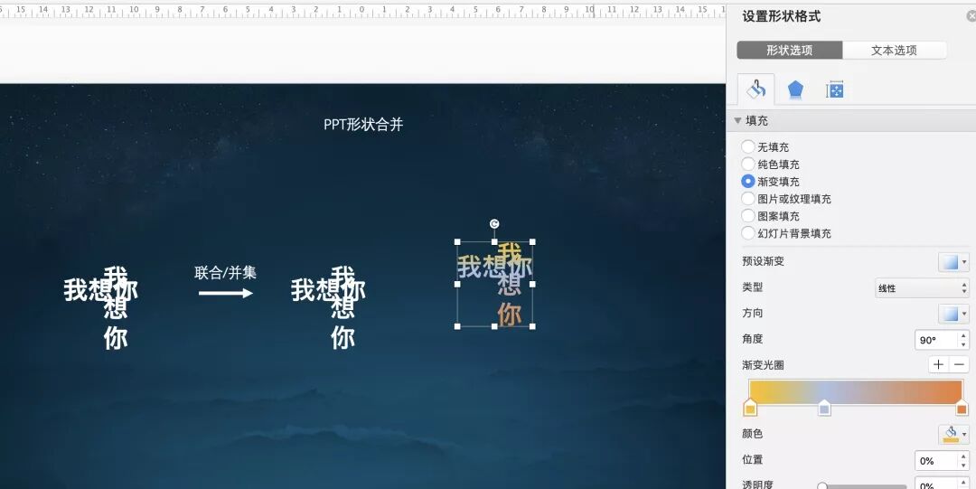 比如,两个“我想你”的文本框联合并集之后,得到的是一个由文字组成的形状,注意这里它已经不是文字了,而是带透明背景的图形,可以在形状窗格进行填充、边框的修饰调整。