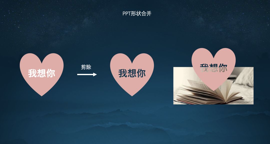 比如,在爱心形状中减去“我想你”3个字之后,得到的就是中间镂空的爱心形状。