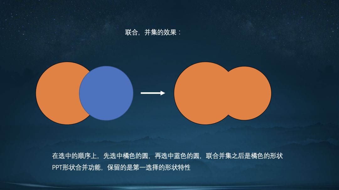 【联合/并集】就是将所选的各个形状联合为一个整体,并保留第一选择的形状特性。比如图中我们先选中橘色的圆,再选中蓝色的圆,联合并集之后是橘色的形状。