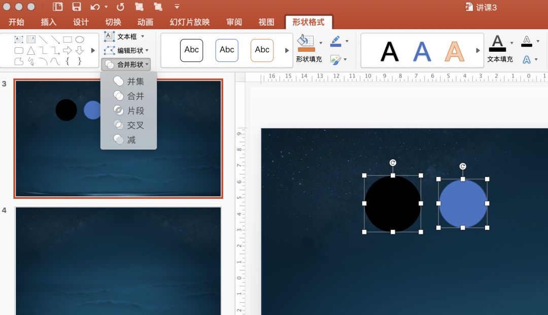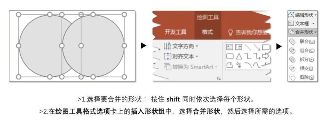 当我们在PPT中同时选中了2个以上的形状时,在形状格式菜单中就可以选择合并形状按钮,分为并集、合并、片段、交叉、减除5种操作。