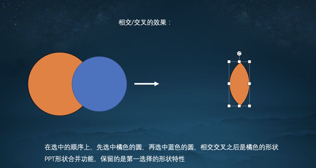【相交/交叉】就是只保留所选图形的相交重叠部分,并保留第一选择的形状特性。比如图中我们先选中橘色的圆,再选中蓝色的圆,相交交叉之后是橘色的形状。