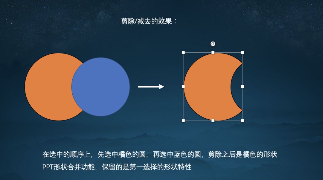 【剪除/减去】就是只保留第一个选中的图形中未被其它图形相交重叠的部分。