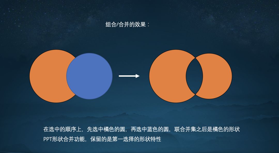 【组合/合并】就是生成所选图形之间的非公共部分的形状,并保留第一选择的形状特性。比如图中我们先选中橘色的圆,再选中蓝色的圆,联合并集之后是橘色的形状。