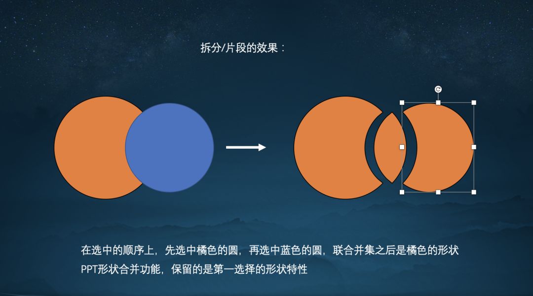 【拆分/片段】就是将所选图形的所有单独部分、相交部分分别拆成一个单独的形状,并保留第一选择的形状特性。比如图中我们先选中橘色的圆,再选中蓝色的圆,拆分之后是橘色的形状。