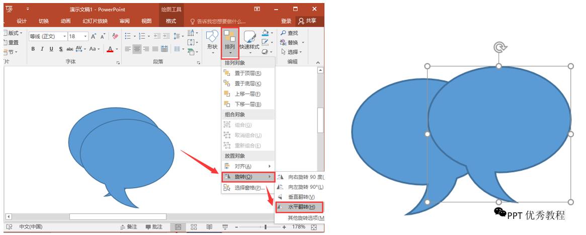(3)选择形状,按Ctrl+D组合键复制一相相同图形,选择复制的图形,执行“格式”-“排列”-“旋转”-“水平翻转”命令将图形水平旋转,并调整其位置,如图所示。