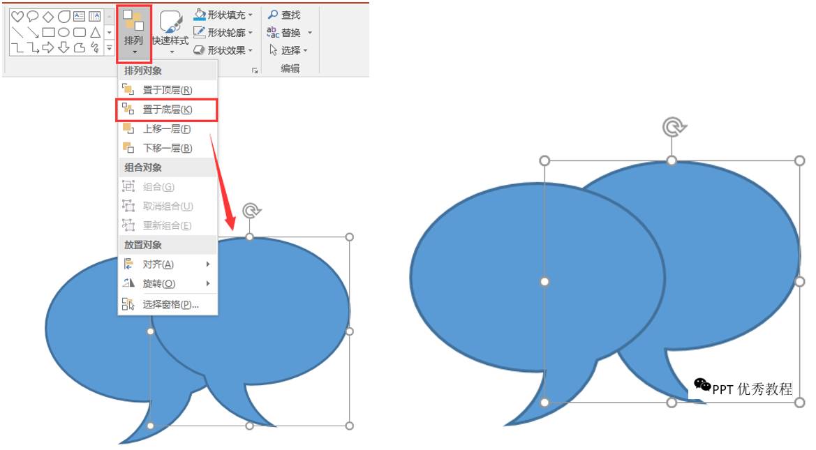 (4)执行“格式”-“排列”-“置于底层”命令,将上方的形状放置于最后面,如图所示。