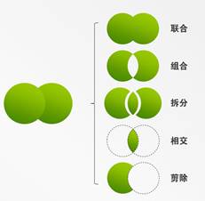 在“合并形状”列表中包含有5个合并类型,分别为联合、组合、拆分、相交和剪除。通常,要选中两个图形或者文字才能应用合并形状工具,合并效果如图所示。