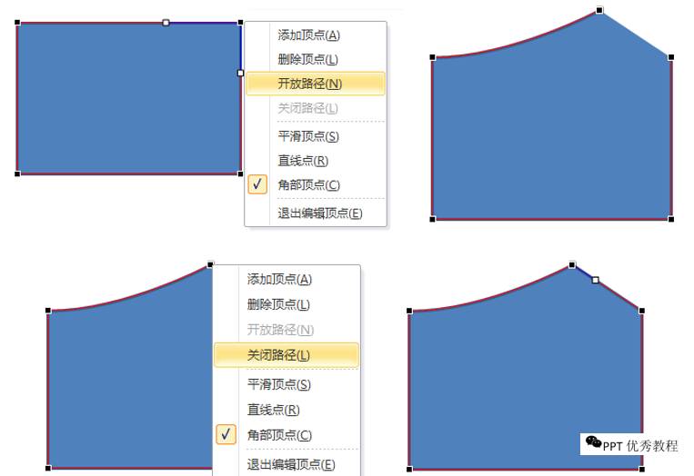 提示:在路径线段上单击鼠标右键,在弹出的快捷菜单中选择“开放路径”命令,可将路径线切断,将形状的路径线分成两段,如图所示。同理,选择“关闭路径”命令,则可以将已经开放的路径线重新合,如图所示。