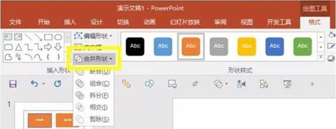 如果我们在PPT的图形库中未找到适合的形状,还可以考虑通过多个形状加减运算快速得到新的形状,比如,快速制作多种多样的图标、改变图形或文字的形状等。它就是PowerPoint 2013版本中的“合并形状”功能。如图所示。