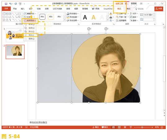 Step01. 按住【Ctrl】键,依次点击图片和半透明泪滴形(这个顺序非常重要,一定不能错了),选择【绘图工具格式】选项卡最左侧的【合并形状】功能,点击下拉菜单中的【相交】功能。(如图 5‑84)