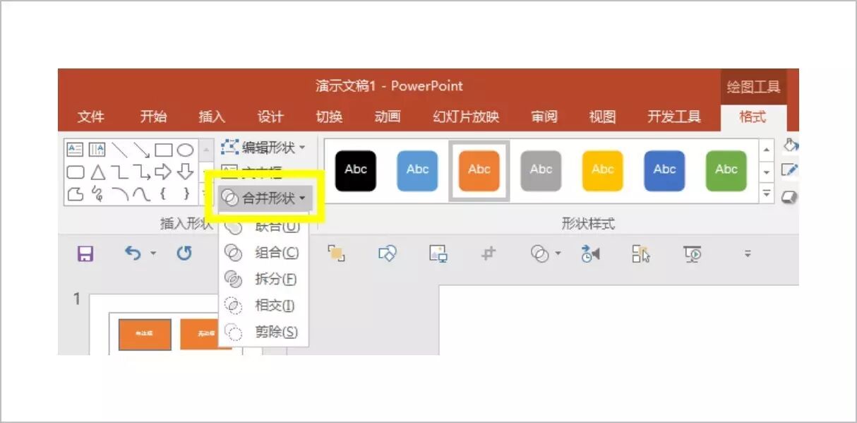 图片中第一个图形需要用到PPT中【绘图工具】菜单栏下【合并形状】的联合功能。