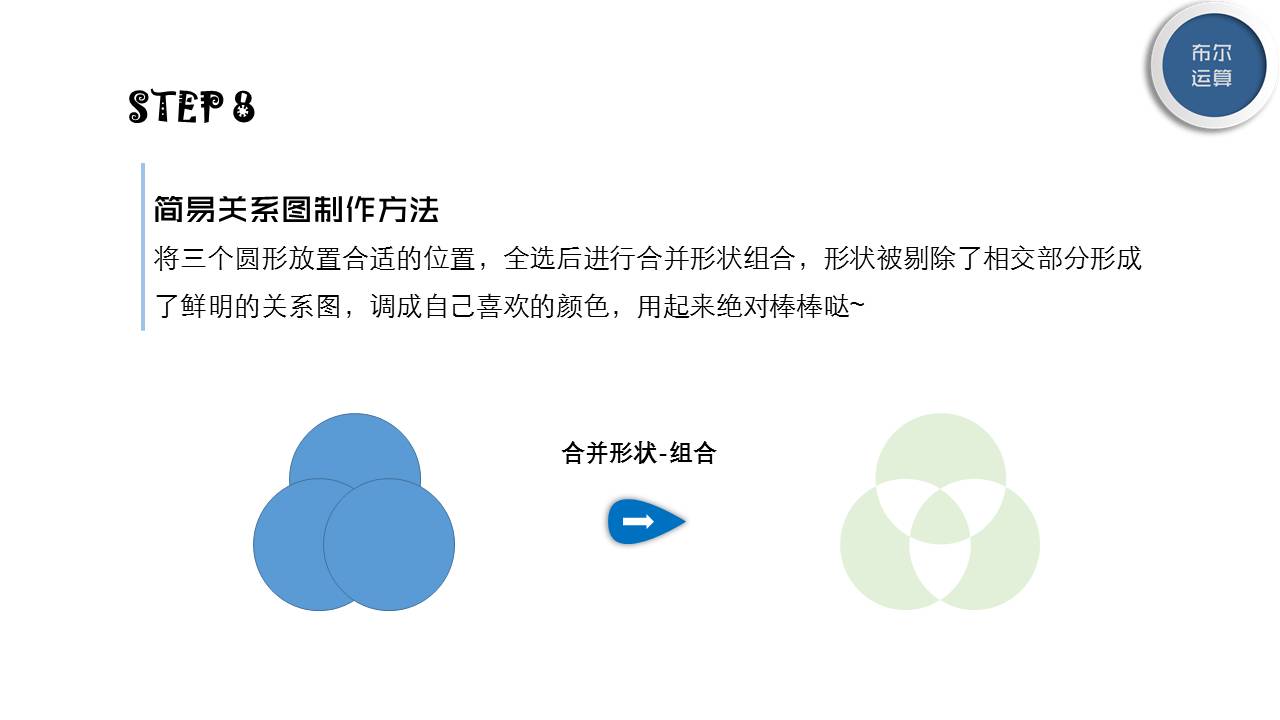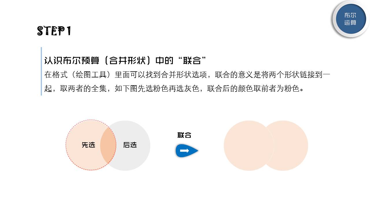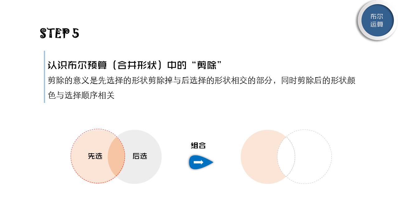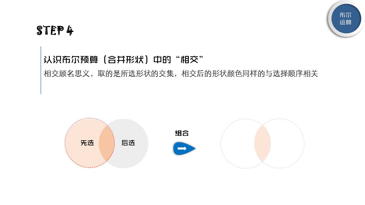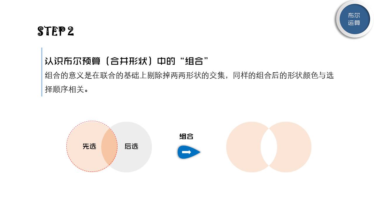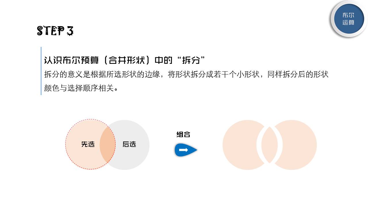布尔运算在PPT中就是合并形状,旨在对于两个及以上的形状进行组合操作的功能。