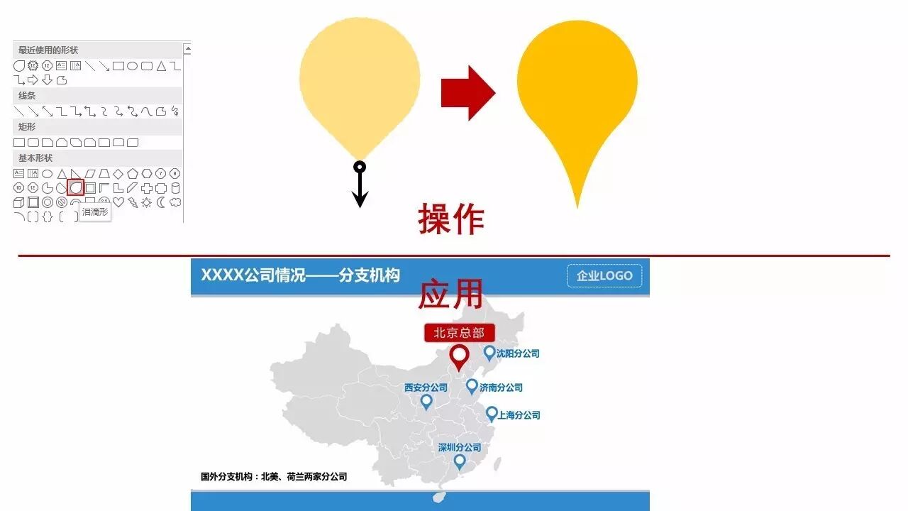 第一个是泪滴,把泪滴的控制点顺着尖角的方向拖动,就形成了右侧的形状,大家有没有觉得有点熟悉,没印象的打开百度地图或者高德地图,导航标注位置用的是不是这个形状?所以这形状我们常常用来表示位置。例如下图我们可以用泪滴来在地图上标注相关机构的位置。