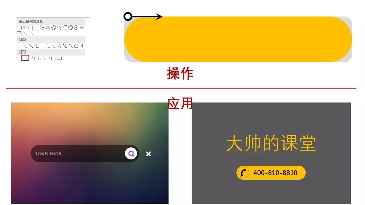 第二个形状是圆角矩形,将圆角矩形的控制点往左拉,圆角矩形的两侧就会变成弧形或半圆形,往右拉就会变成直角。这个形状常常用在PPT里面做搜索框或者放置电话号码,如左下图和右下图。