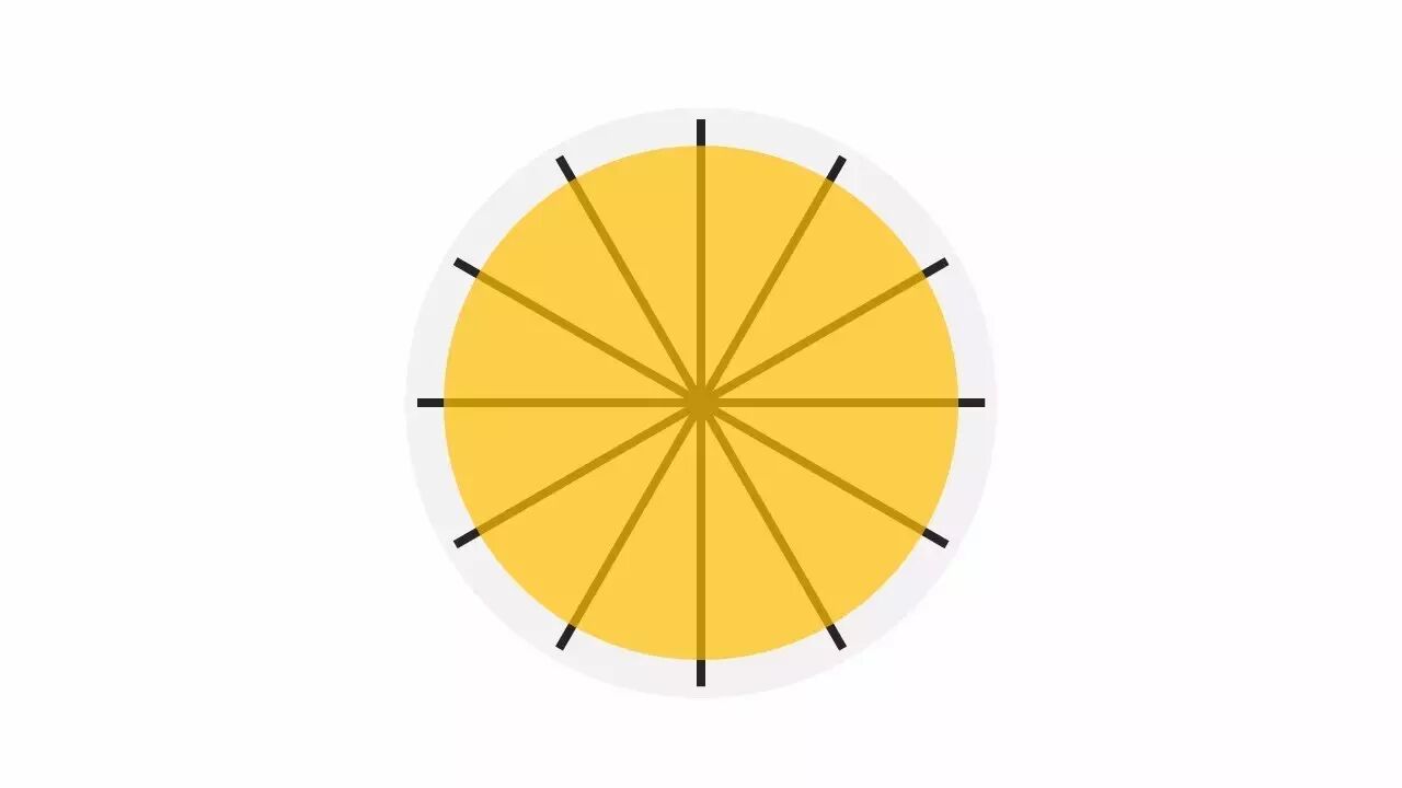 二、采用障眼法,绘制6条直线相交,每条直线相对前一条旋转30°(实际绘制过程,可以利用对称的特性,只要绘制三条,再复制做旋转即可),然后在上方绘制一个比大圆略小的同心圆,覆盖在上方(大家可以把黄色的圆想想成不不透明的),这样看到就是12条线段组成的表盘了。