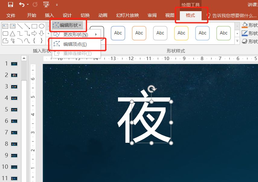 2、点击【格式】>【编辑形状】,在菜单中选择【编辑顶点】。