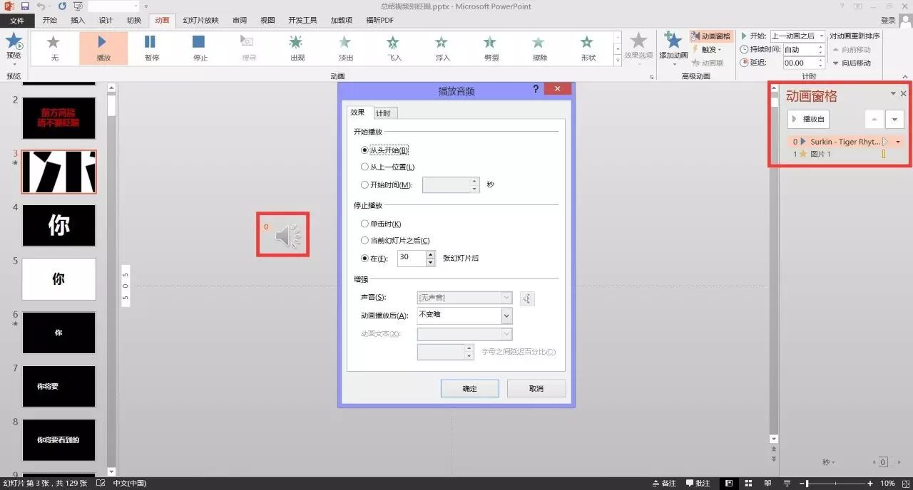 选中音乐,点击【动画】→【动画窗格】→【效果】→【在xx张幻灯片后】