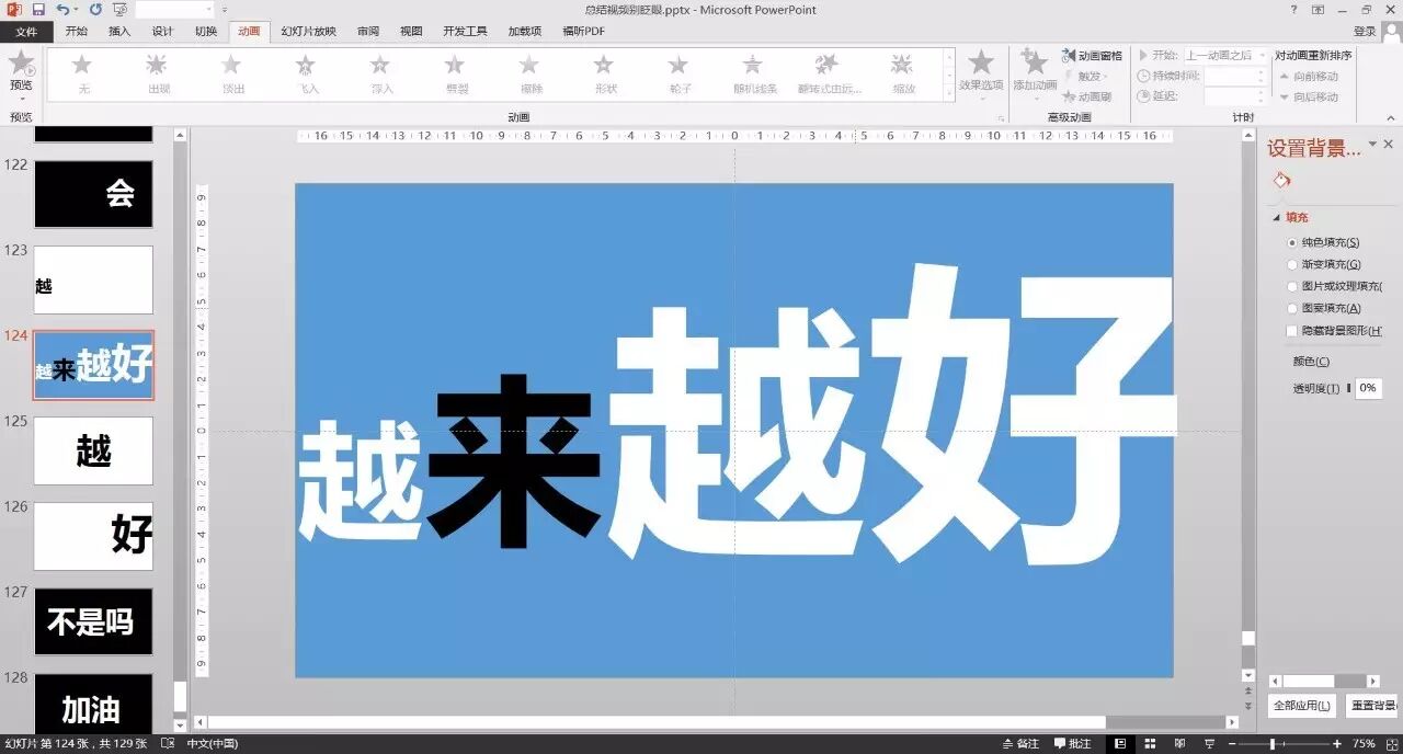 例如越来越好这递进的效果,为了达到字体越来越大,而且刚好文字效果能够铺满整个屏幕,所以我先把四个字都放在一页,然后背景白色,要显示的文字黑色,其余的字体都白色,这样其他的都看不见了,达到了我想要的效果(截图蓝色背景为显示效果)