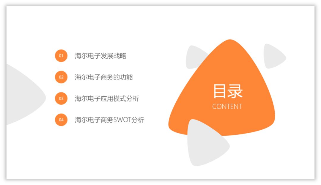 对于目录或者过渡页也可以借助灰色的形状处理,一来增加设计感,二来可以区分标题内容。