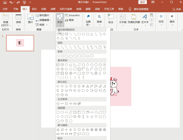 如图,在菜单栏中点击【插入】-【形状】,选择需要的形状并进行调整。点击【格式】-【形状填充】-【图片】,导入图片,将素材插入到形状。