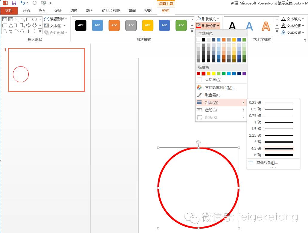 第四步:选中圆,设置形状轮廓为红色,再更改粗细为“4.5磅”(大小合适即可)