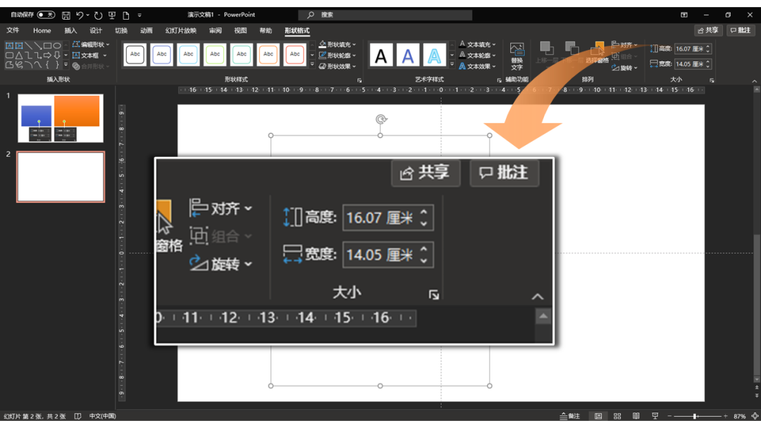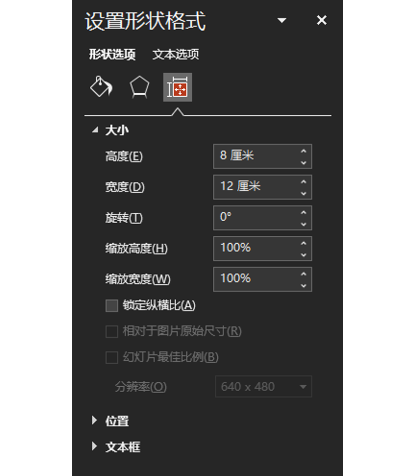 选项卡上的“大小”选项还是相对简单。如果需要更多样的调整,则可以右击形状进入“设置形状格式”的面板,找到“大小”的详细选项。在这里又可以发现,除了直接输入形状高度和宽度的数值外,还能按百分比调整形状大小。