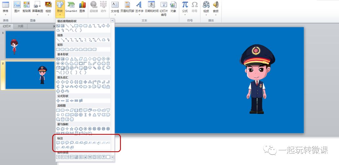 1.选择【插入】-【形状】-【标注】-为男主人公添加标注;
