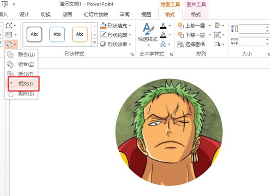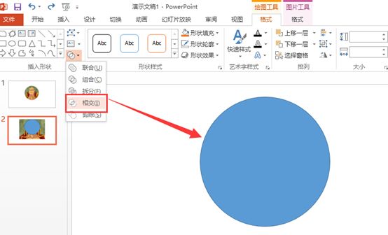 首先选中图片,然后按住“Ctrl”键的同时再选中形状。然后单击“绘图工具-格式”选项卡中的“合并形状”按钮,在打开的下拉列表中选择“相交”选项。此时可以看到图片变成了我们需要的形状的样式。