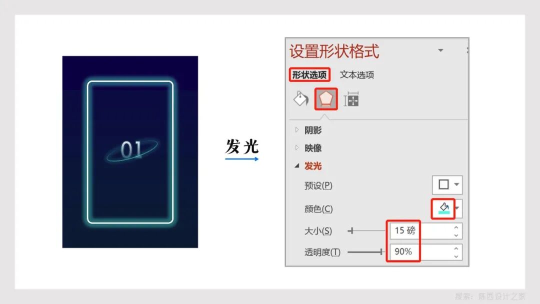 这个在形状选项的效果里面就可以找到发光的设置选项了,可以调节发光的颜色以及大小。