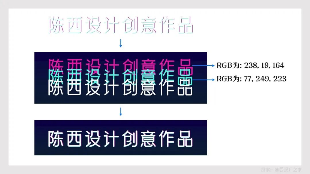 将主标题复制成三个一样的,分别调节颜色为白色,青绿色,紫红色。