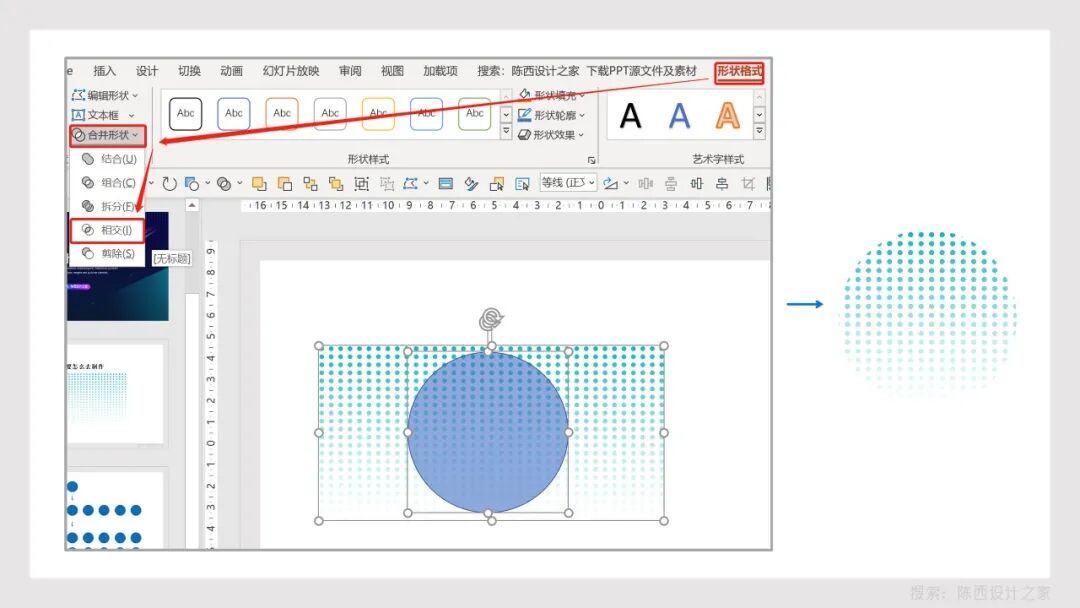 全选这些圆形,在形状格式里的合并形状中,使用结合,将这些圆形变成一个整体的形状。注意这里不同于组合。