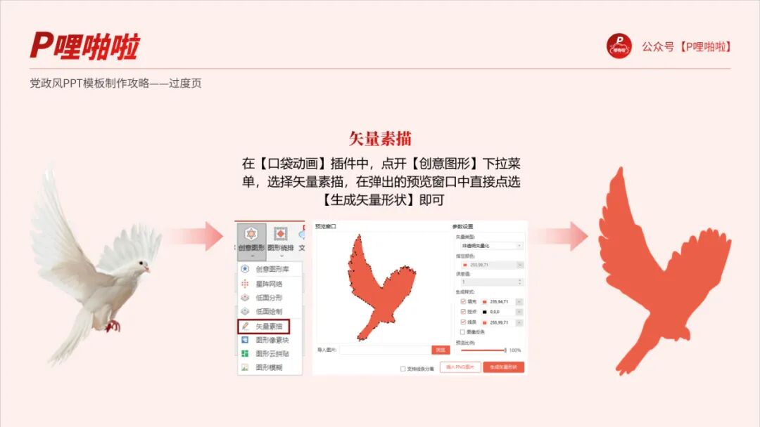 一般来说,鸽子这样的元素会是图片素材,拿到PPT中后不方便调整成我们想要的色调、位置和大小,所有需要转化成可编辑的形状