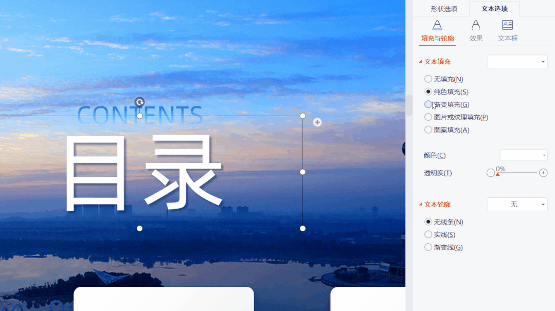为了让文字更有层次感,可以给“目录”两个字设置渐变。