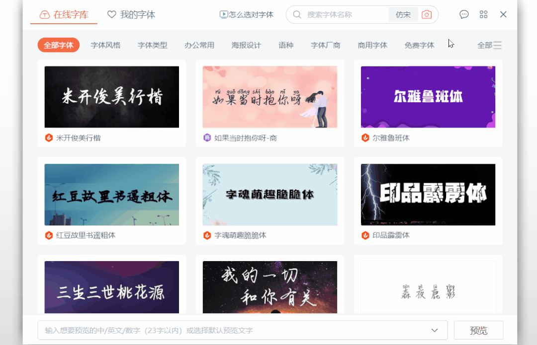 也可以直接点击“免费字体”,并在下方文本框中输入文字,点击【预览】,即可预览免费字体对应的效果。