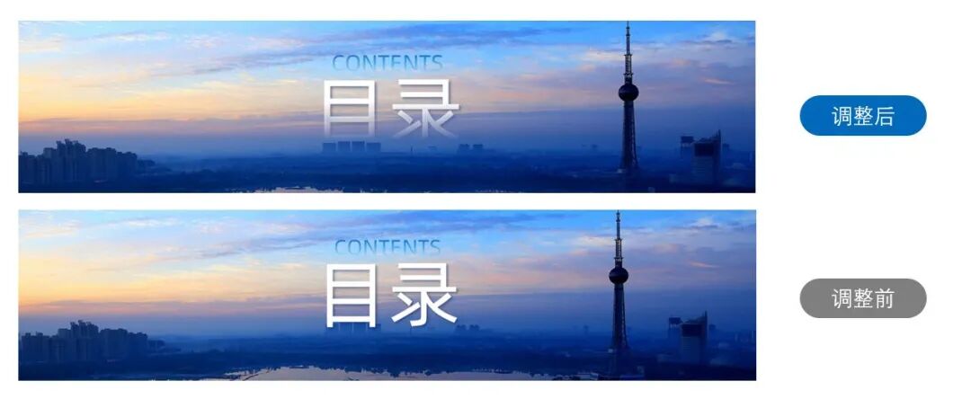 强化标题文字的对比,比较常见的“大小对比”、“颜色对比”、“大小对比”等,突出重点文字并增强层次感。