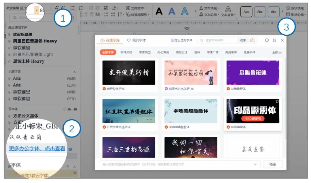 有同学可能会因为选择太少犯愁。如果使用的是WPS,那就简单了。在字体下拉菜单中有一个“云字体”,可以在线下载安装,非常方便!