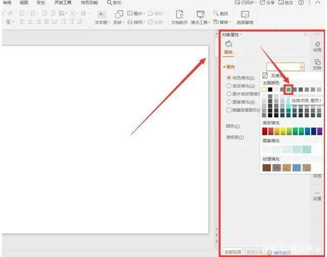 步骤三:右击后,编辑页面右侧会出现设置颜色的属性栏。选择颜色即可设置PPT底色,大家根据喜好选择即可!